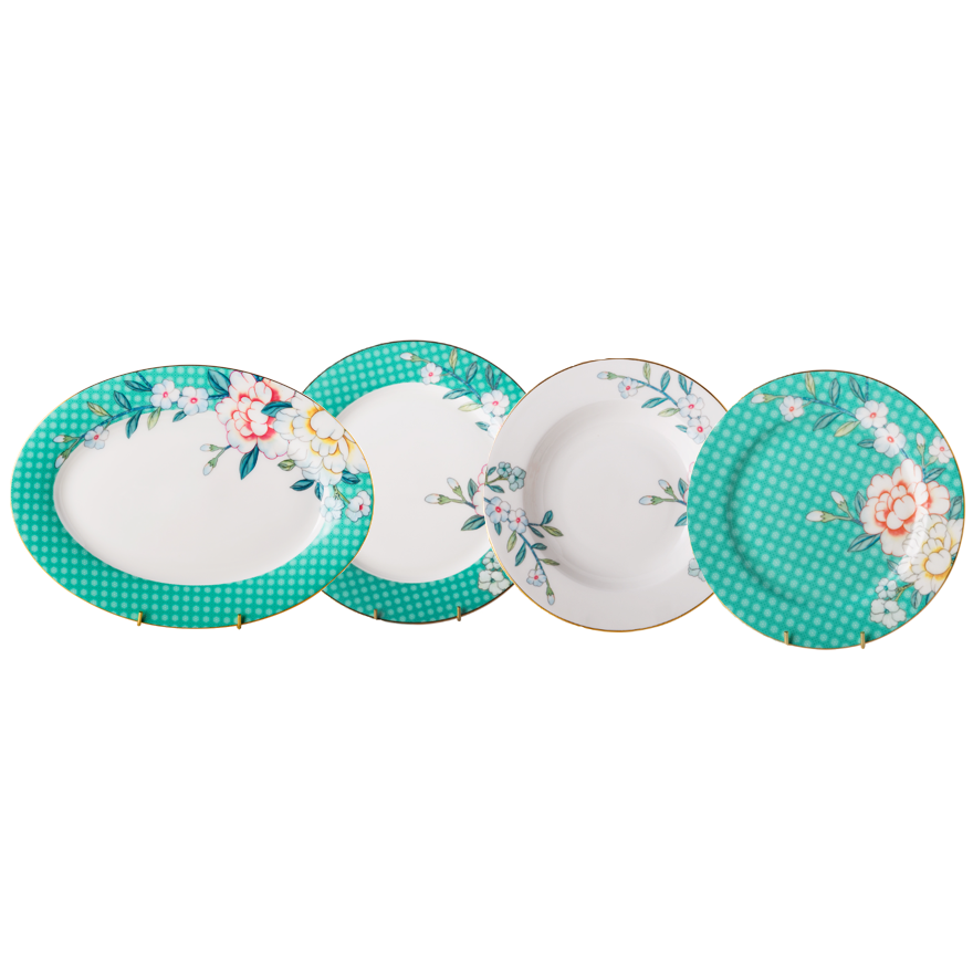 Коллекция Соланж отличается прекрасным дизайном предметов с роскошными цветами розово-белых оттенков на бирюзовом фоне, золотой отделкой, классическими формами в традиционном французском стиле.