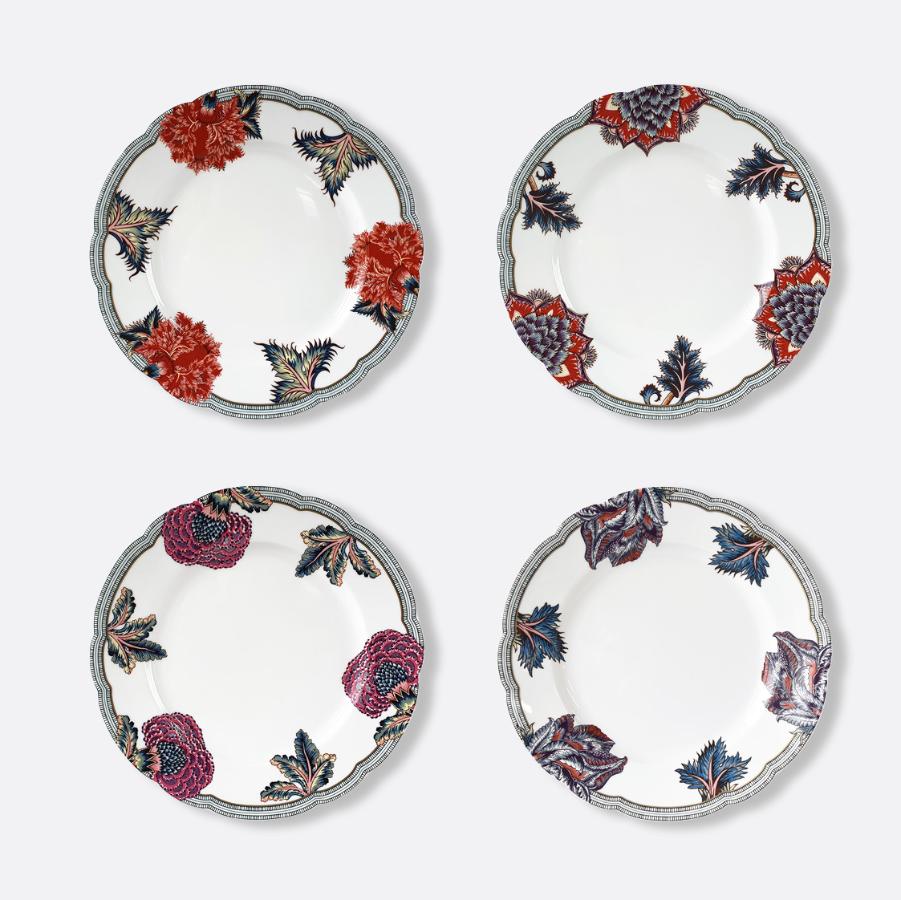 На четырех обеденных тарелках величественные воображаемые цветы украшает черно-белый фриз по зубчатым краям, контрастирующий с яркими лепестками.
