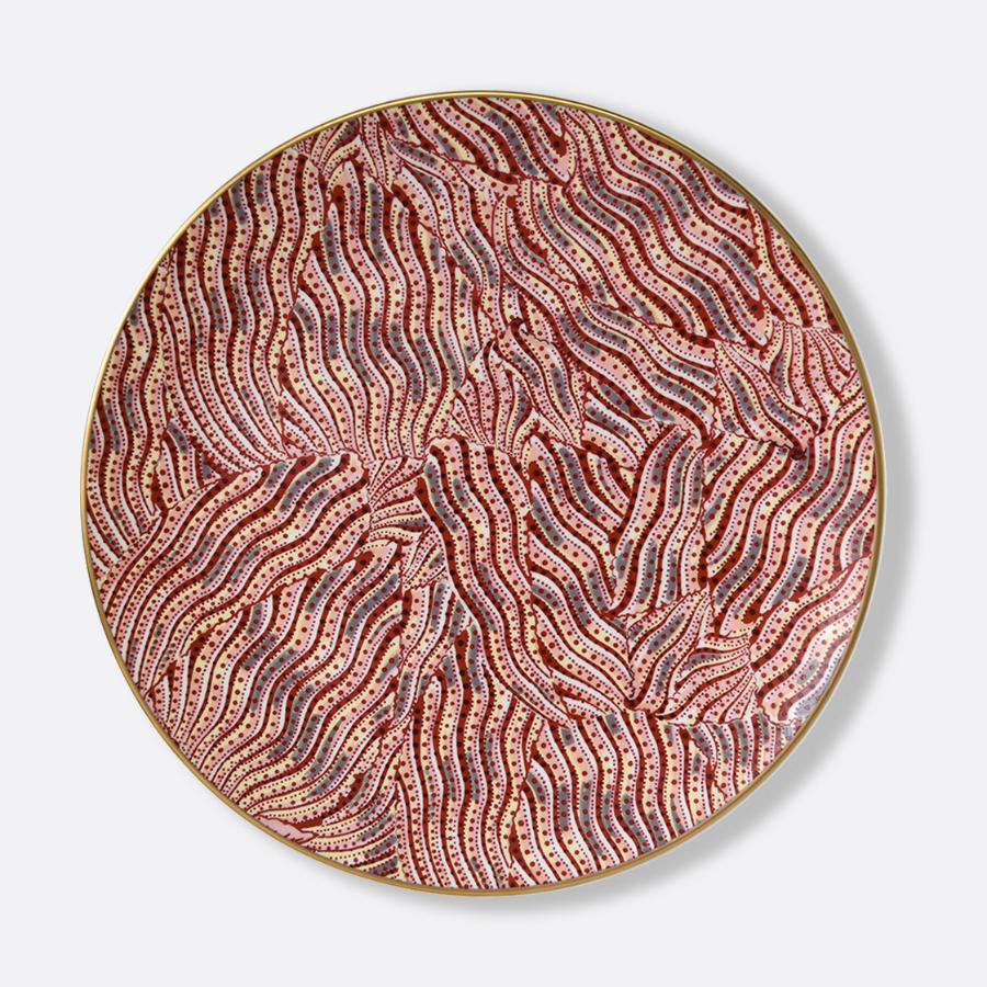 Полностью декорированная презентационная тарелка повторяет детали цветка, полосы которого кажутся вибрирующими под светом.